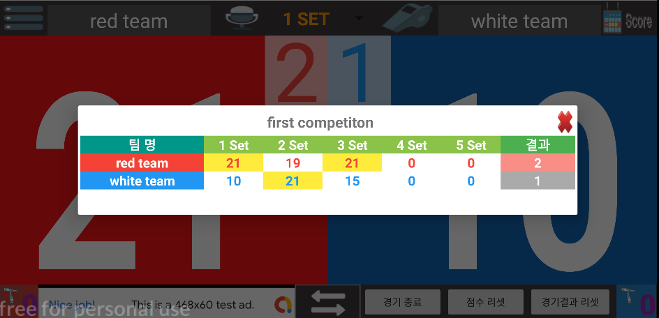 점수 음성안내와 휘슬 사운드가 지원되는 배구점수판 앱을 사용하세요.