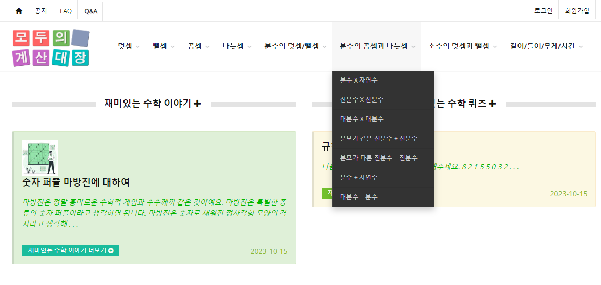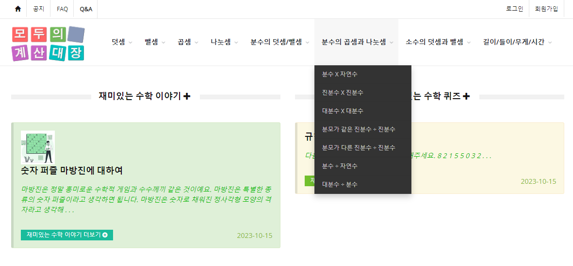 일곱째, 학습외에도 재미있는 수학 이야기와 수학 퀴즈를 제공하고 있습니다.