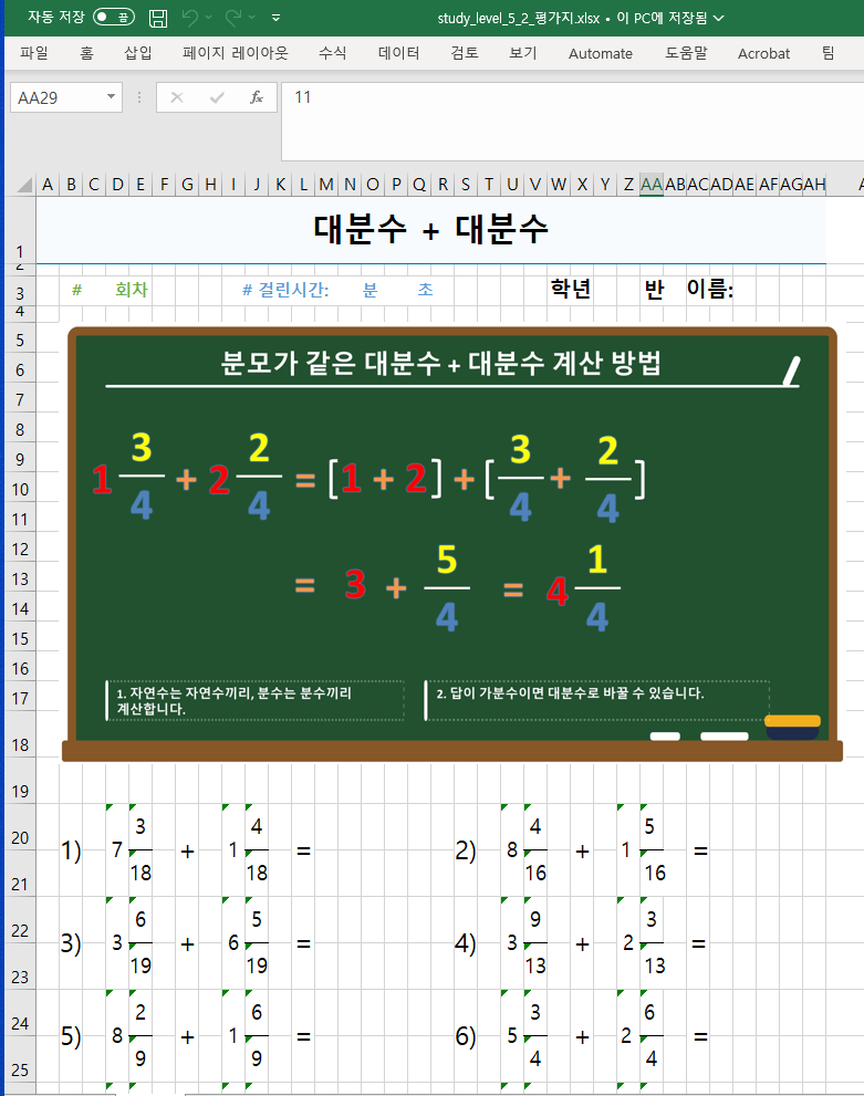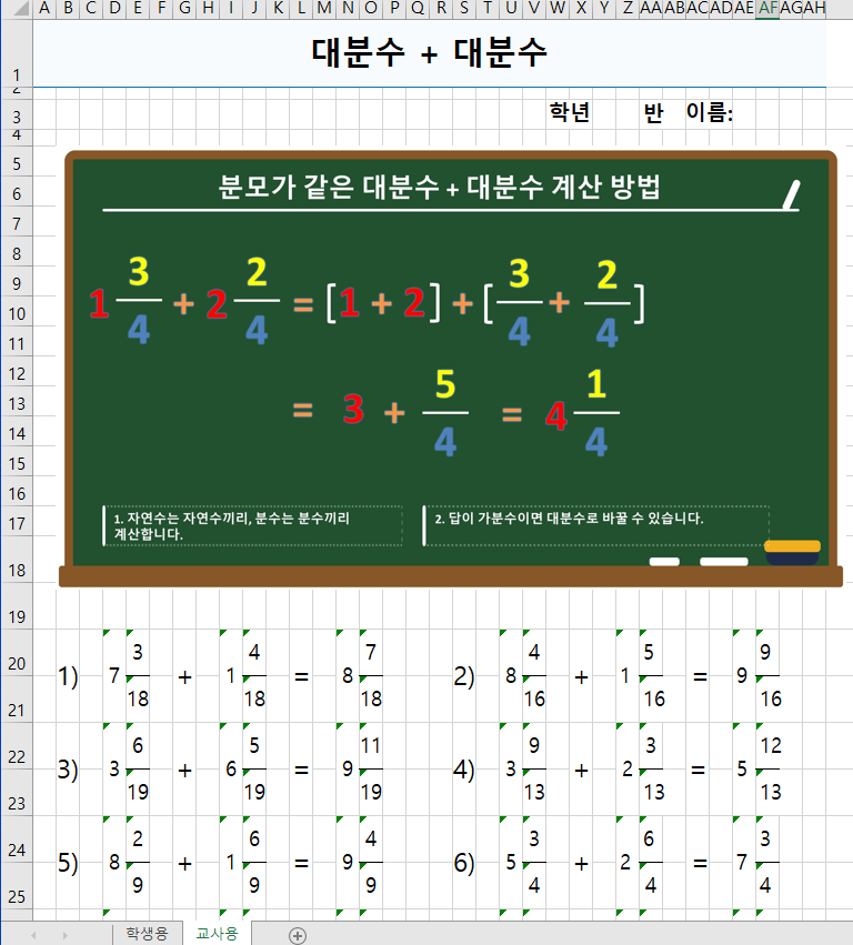 넷째, 선택한 학습 내용을 엑셀파일의 학습지로도 다운로드 할 수 있고, 학습지내 교사용과 학생용 시트를 함께 제공합니다.